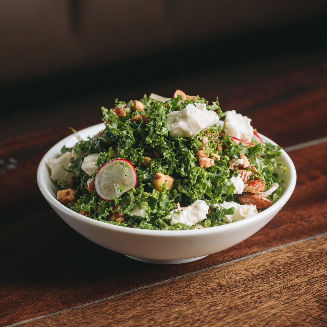 Kale and Feta Salad – Chopped Kale, Almonds, Feta Cheese, Baby Radish, Shallots and Lemon Maple Dressing.